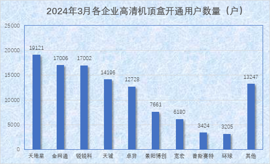 截至2024年3月31日,共發(fā)展高清用戶7,146,423戶。3月新增高清用戶103,706戶,28個(gè)機(jī)頂盒企業(yè)發(fā)展高清用戶數(shù)據(jù)見(jiàn)下圖: