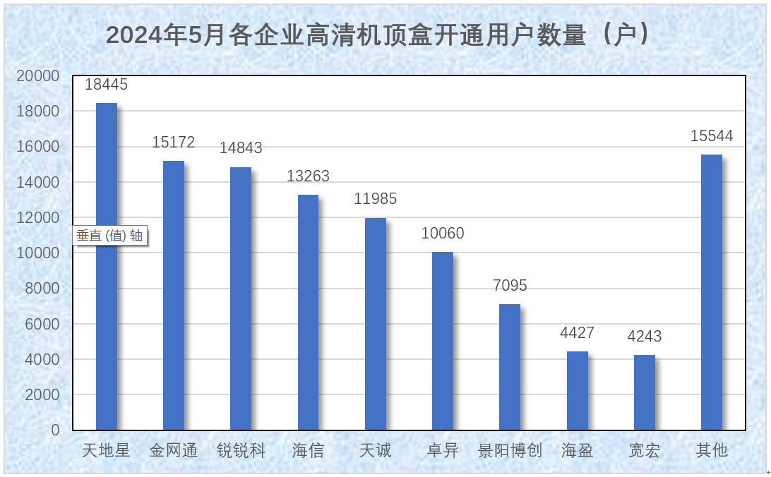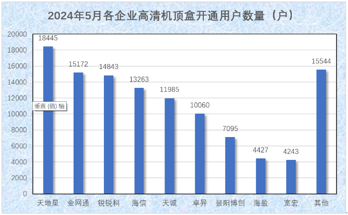 截至2024年5月31日,共發(fā)展高清用戶7,395,536戶。5月新增高清用戶127,381戶,28個(gè)機(jī)頂盒企業(yè)發(fā)展高清用戶數(shù)據(jù)見(jiàn)下圖: