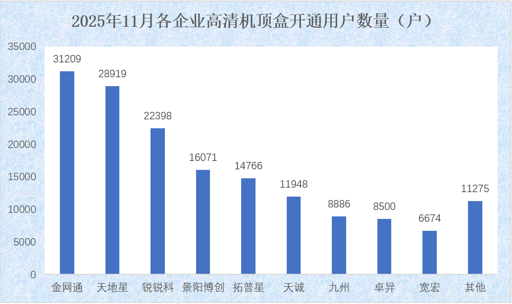 截至2025年11月30日,衛(wèi)星直播中心累計發(fā)展直播衛(wèi)星用戶15506萬戶,累計發(fā)展高清用戶999萬戶。11月新增高清用戶16萬戶,34個機頂盒企業(yè)發(fā)展高清用戶數(shù)據(jù)見下圖: