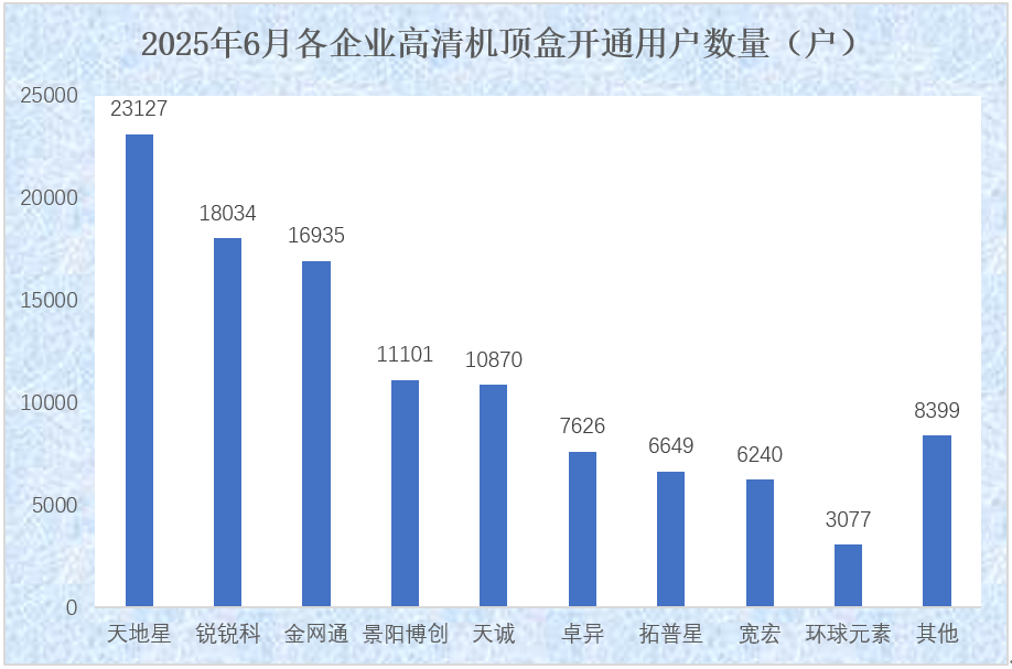 截至2025年6月30日,衛(wèi)星直播中心累計發(fā)展直播衛(wèi)星用戶15435.3萬戶,發(fā)展高清用戶924.4萬戶。本月新增高清用戶11.2萬戶,30個機頂盒企業(yè)發(fā)展高清用戶數(shù)據(jù)見下圖: